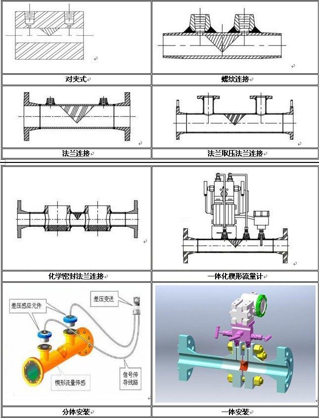 楔形流量計按其組裝方式分為一體型和分離型,按其連接方式分為法蘭連接、焊接連接、螺紋連接及對夾式連接,按其取壓方式分為普通取壓、法蘭密封取壓等結構。