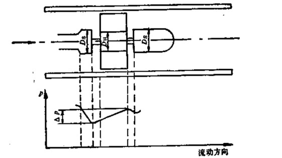 由于流體通過(guò)渦輪時(shí)會(huì)對(duì)渦輪產(chǎn)生一個(gè)軸向推力,使鈾承的摩擦轉(zhuǎn)矩增大,加速鈾承磨損,為了消除軸向力,需在結(jié)構(gòu)上采取水力平衡措施,這方法的原理見(jiàn)圖3-3所示。由于渦輪處直徑DH略小于前后支架處直徑Ds,所以,在渦輪段流通截而擴(kuò)大,流速降低,使流體靜壓上升 P,這個(gè) P的靜壓將起到抵消部分軸向推力的作用。