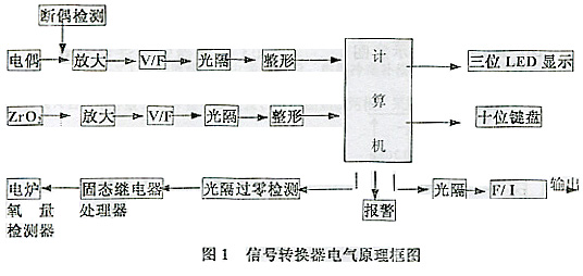 將來自氧量檢測器的模擬信號(氧勢、熱電勢)分別調(diào)制成0-10KNz調(diào)頻信號,經(jīng)光電隔離后送至計算機(jī),采用調(diào)頻方式能將儀表輸入、輸出相互隔離,這樣就消除了諸如大電流跳變所引起的干擾,能夠克服高共模電壓,因而大大提高了儀表的抗干擾能力。應(yīng)用程序主要由主程序和子程序組成,所有的程序都采用模塊結(jié)構(gòu)編制,便于修改、增加軟件功能,以滿足不同用戶的特殊需要。程序運算采用了三位浮點數(shù),保證了運算勞動精度,對氧濃、爐溫的計算,采用查表線性插值法,對爐溫的控制采用增量式PID算式控制。信號轉(zhuǎn)換器的電氣原理框圖見圖1