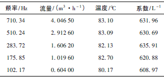 根據(jù)上述檢測設備及條件,按照JJG1037—2008《渦輪流量計檢定規(guī)程》,在四種不同黏度下各檢定5個點,每點檢定3次,得到的數(shù)據(jù)如表1~表4所示,數(shù)據(jù)表中的頻率、流量、溫度、系數(shù)均為每點檢定3次各自的平均值。由表1得到儀表線性度為8.9%,儀表系數(shù)為528.61L-1;由表2得到儀表線性度為6.3%,儀表系數(shù)為553.89L-1;由表3得到儀表線性度為2.6%,儀表系數(shù)為596.18L-1;由表4得到儀表線性度為2.2%,儀表系數(shù)為622.44L-1。