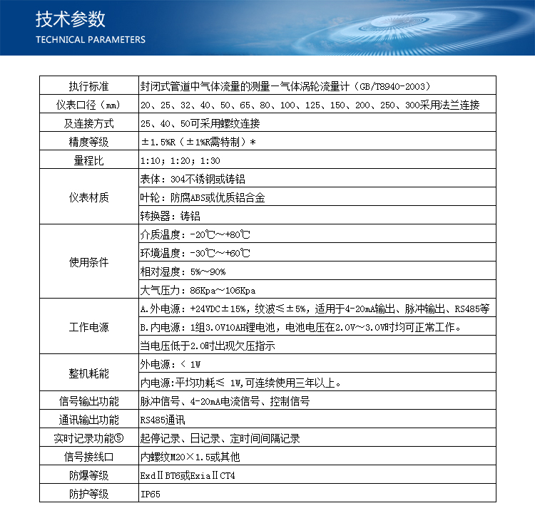 LK-LWGQ系列智能一體化氣體渦輪流量計是采用先進的超低功耗單片微機技術(shù)研制的渦輪流量傳感器與顯示積算一體化的新型智能儀表,采用雙排液晶現(xiàn)場顯示,具有機構(gòu)緊湊、讀數(shù)直觀清晰、可靠性高、不受外界電源干擾、抗雷擊、成本低等明顯優(yōu)點。儀表具備儀表系數(shù)三點修正,智能補償儀表系數(shù)非線性,并可進行現(xiàn)場修正。高清晰液晶顯示器同時顯示瞬時流量(4位有效數(shù)字)及累積流量(8位有效數(shù)字,帶清零功能)。所有有效數(shù)據(jù)掉電后保持10年不丟。該類渦輪流量計均為防爆產(chǎn)品,防爆等級為:ExdIIBT6。