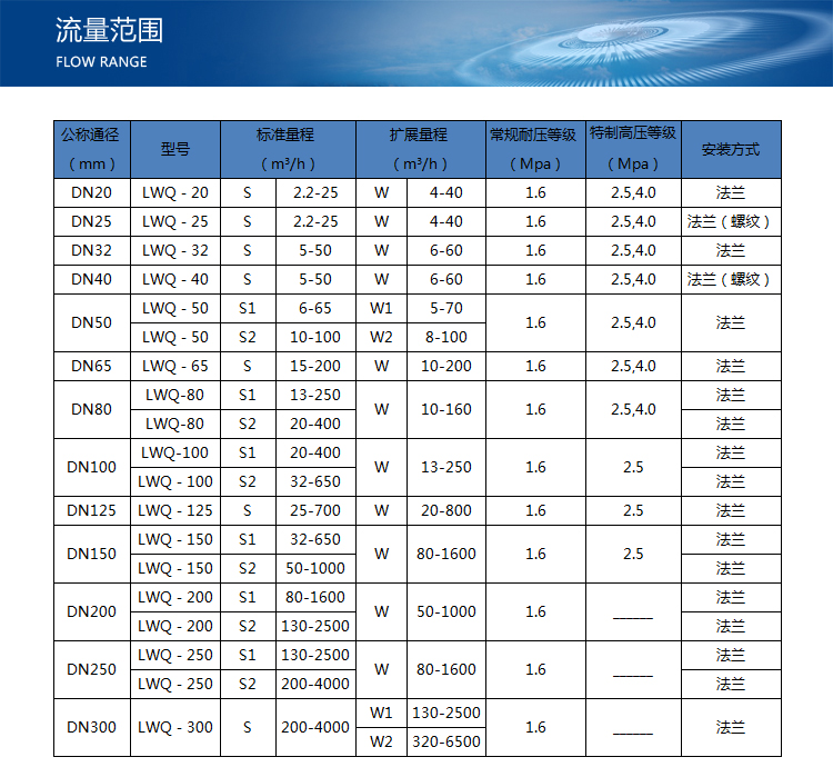 注:用戶在選型時,應(yīng)根據(jù)管道公稱壓力、介質(zhì)最高壓力、介質(zhì)溫度、介質(zhì)組分情況、流量范圍及信號輸出要求合理選擇流量計的型號規(guī)格。為使流量計的使用性能,流量計的使用流量范圍應(yīng)在(20%~80%)Qmax范圍內(nèi)比較合適。